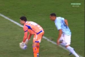 布伦诺在开球时并未注意到对方球员,把球抛到地上后,直接被身后的卡洛斯·维尼修斯“偷鸡”,轻松打空门得手。