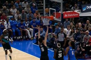 NBA生涯首个三分!杨瀚森迎着哈滕三分轰进!