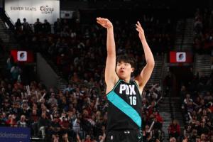 NBA生涯首个三分!杨瀚森迎着哈滕三分轰进!