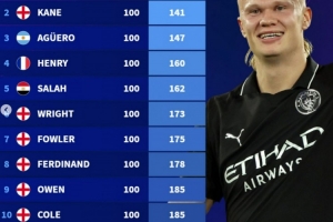 体育资讯11月3日讯 德转盘点了英超历史达成百球最快用时榜,而哈兰德107场98球十分有望创造新的纪录,以下为具体榜单: